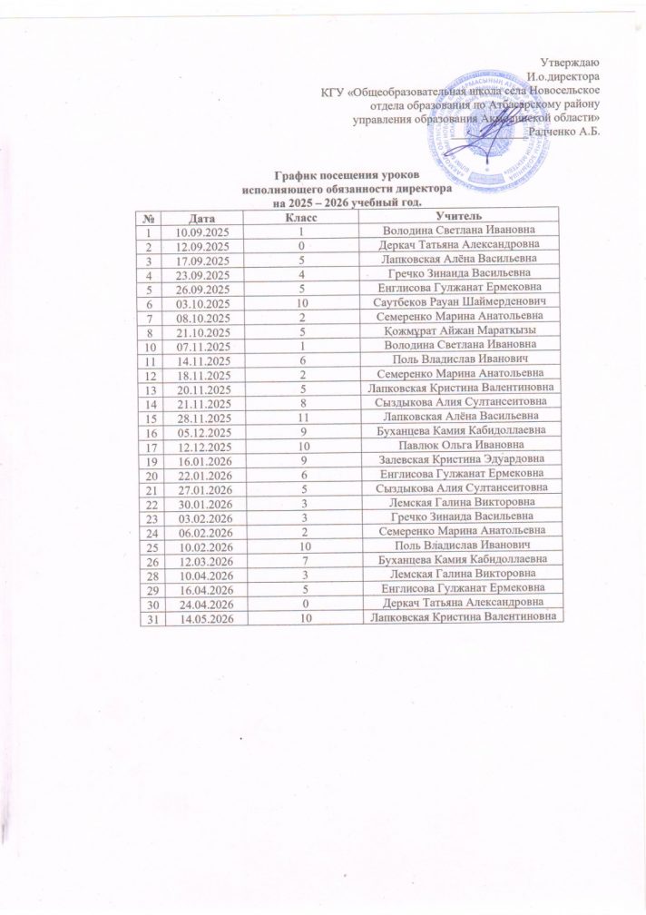 Директордың міндетін атқарушының 2025–2026 оқу жылының сабаққа қатысу кестесі